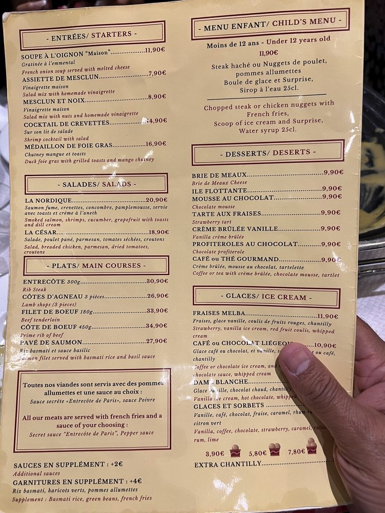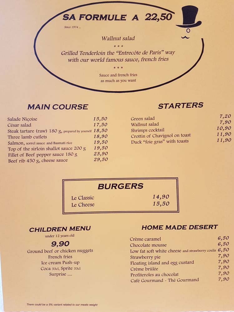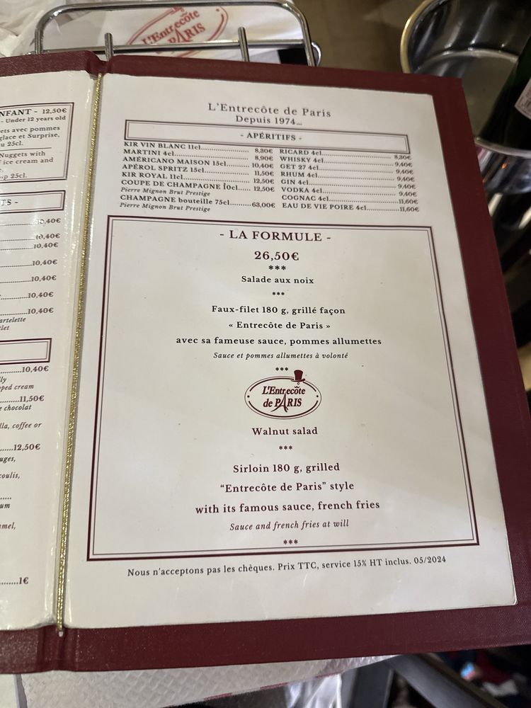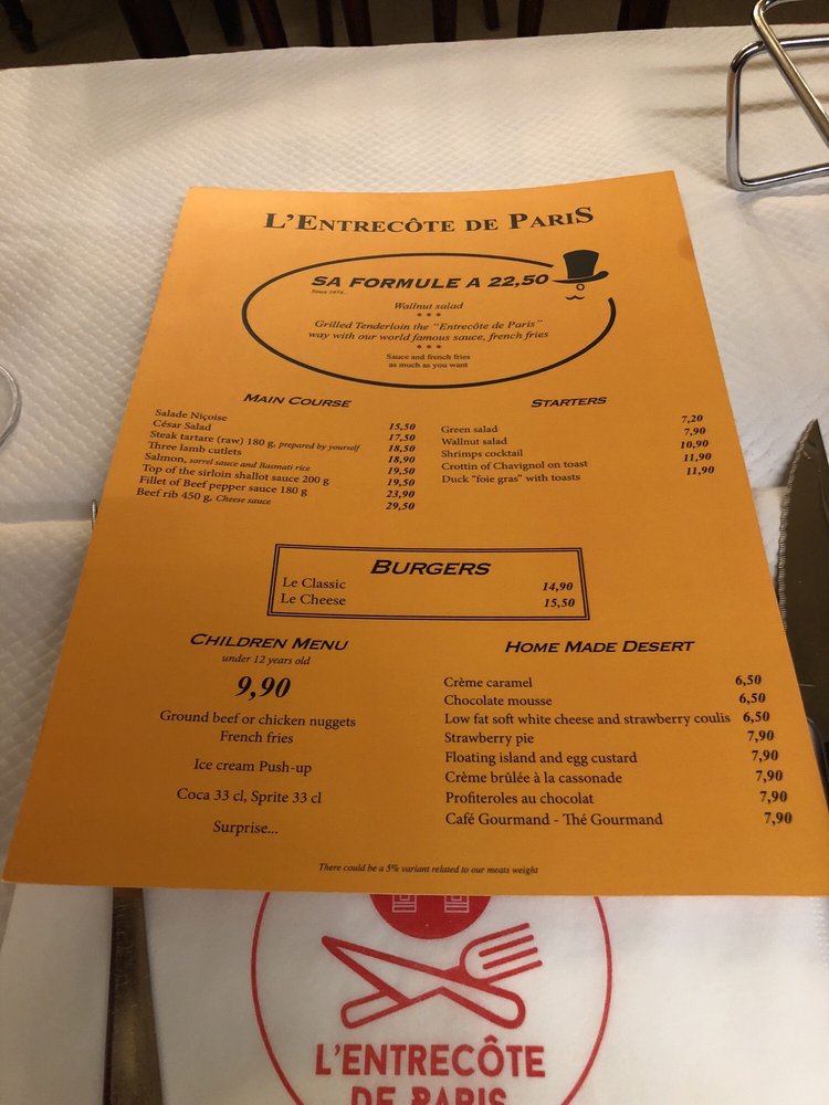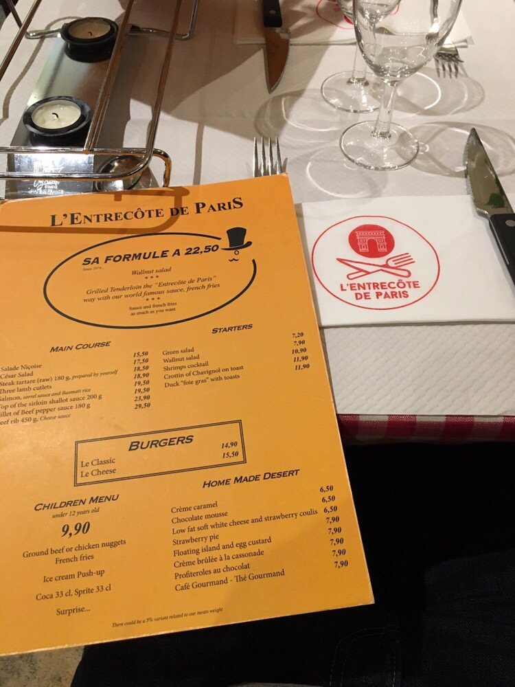 L’Entrecôte de Paris Menu
